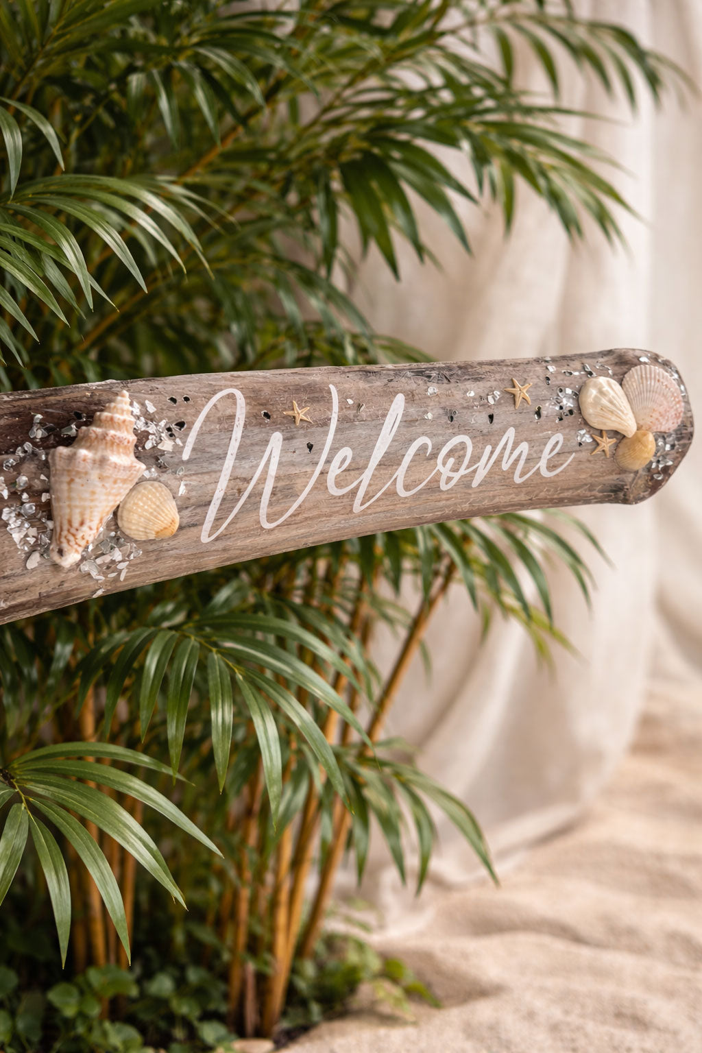 This handmade coastal “Welcome” sign is crafted from natural bamboo and decorated with real seashells, tiny starfish and sea glass details. Inspired by the relaxed Caribbean lifestyle, it adds a beautiful beach-house feel to any space.