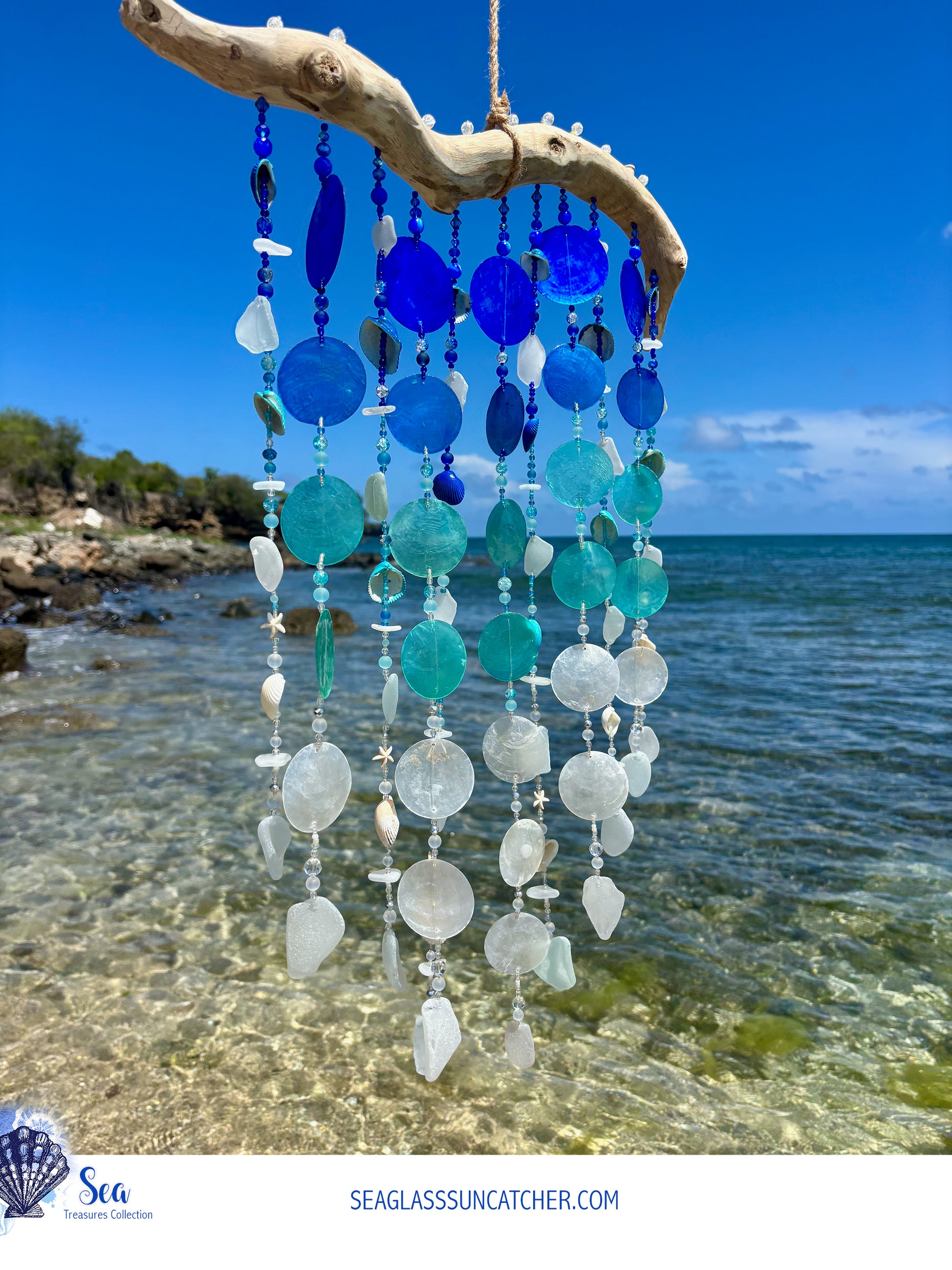 Crafted from sea glass, delicate shells, and shimmering glass beads, this piece captures the essence of the ocean and brings a touch of coastal charm to your home. As the gentle breeze dances through the chime, the soothing sounds create a tranquil atmosphere, perfect for relaxation or meditation. The vibrant blue hues reflect sunlight beautifully, adding a splash of color to your garden, patio, or balcony. Whether you're looking to enhance your outdoor decor or searching for a unique gift for a loved one, this sea glass, shell wind chime is sure to delight and inspire. Embrace the calming vibes of the sea and let this exquisite wind chime be the perfect addition to your sanctuary.