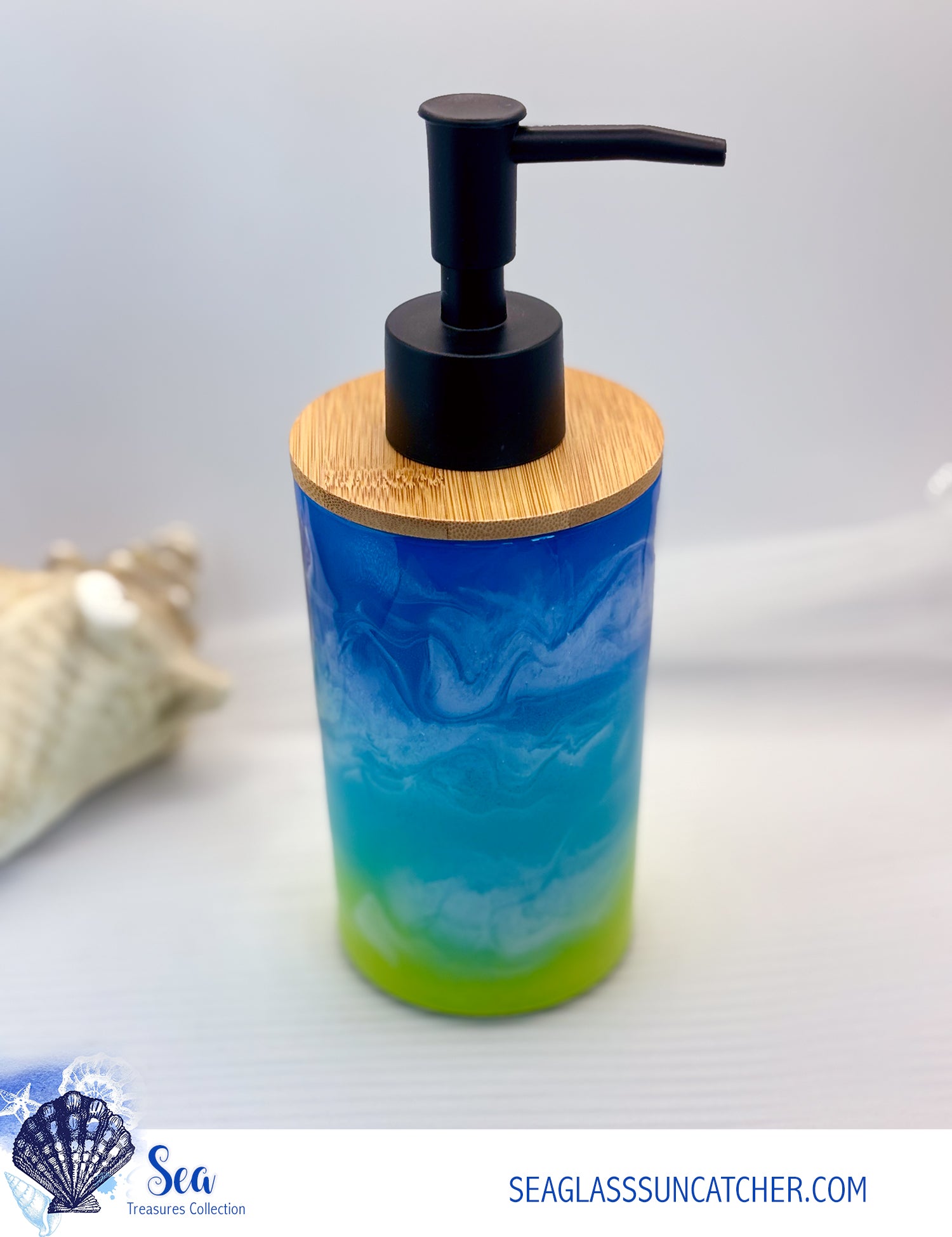 Add a splash of ocean vibes to your bathroom with our hand-painted Ocean Soap and Lotion Dispenser. This unique dispenser features a beach theme with bright colors and wave resin detailing, making it the perfect addition to your coastal decor.